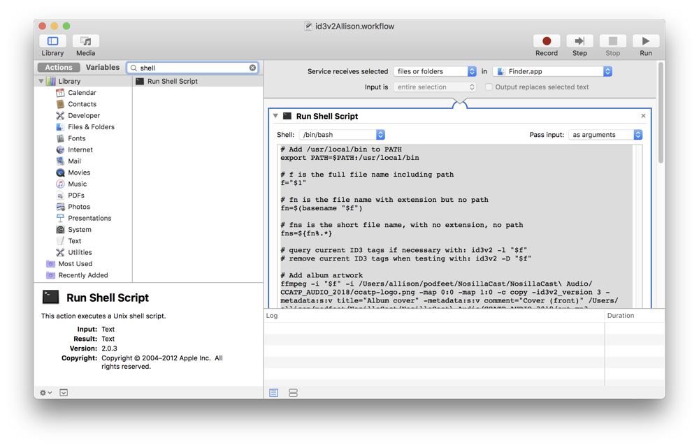 My goal was to write an Automator Service where I could right-click on an MP3 file, choose Services, and have it add all of the ID3 tags in one quick go of it. I knew that Automator itself wouldn’t have the tools, but it would allow me to add scripts inside it using the simple Run Shell Script block and then write a BASH script inside it.