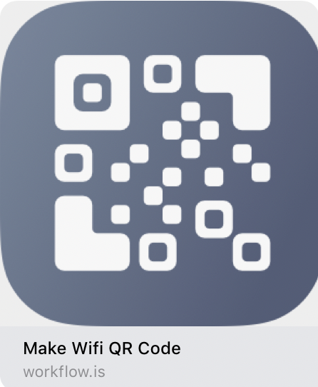 One makes any URL into a QR Code workflow.is/…: And the second one makes a WiFi login code: workflow.is/….