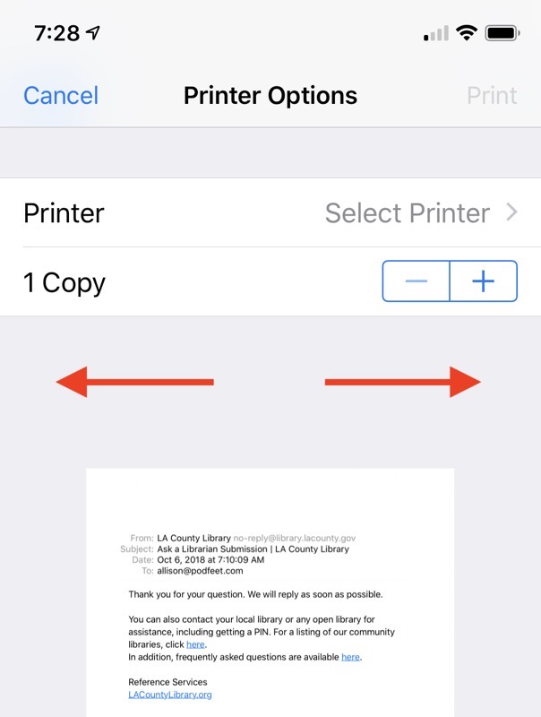 When you see the options, choose Print. We’re not going to print to paper, we’re going to print to PDF. Here’s the really slick trick that causes print to PDF. When the image comes up on screen where you would normally choose a printer, instead use your fingers to pinch OUT. This will make a full-screen PDF that you could save to Files or Dropbox or other services. But we’re not going to save.