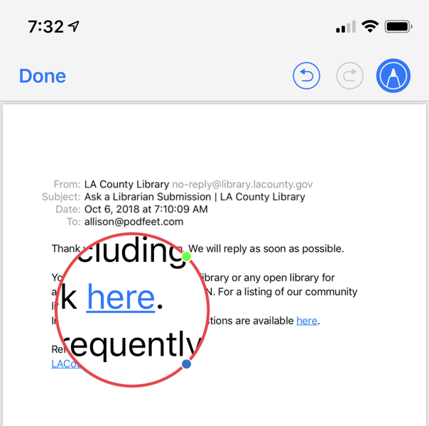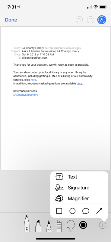 Mark up as you desire. By the way, did you ever notice the plus sign in the bottom right lets you insert text, your saved signature, a magnifying glass and geometry like boxes and arrows?