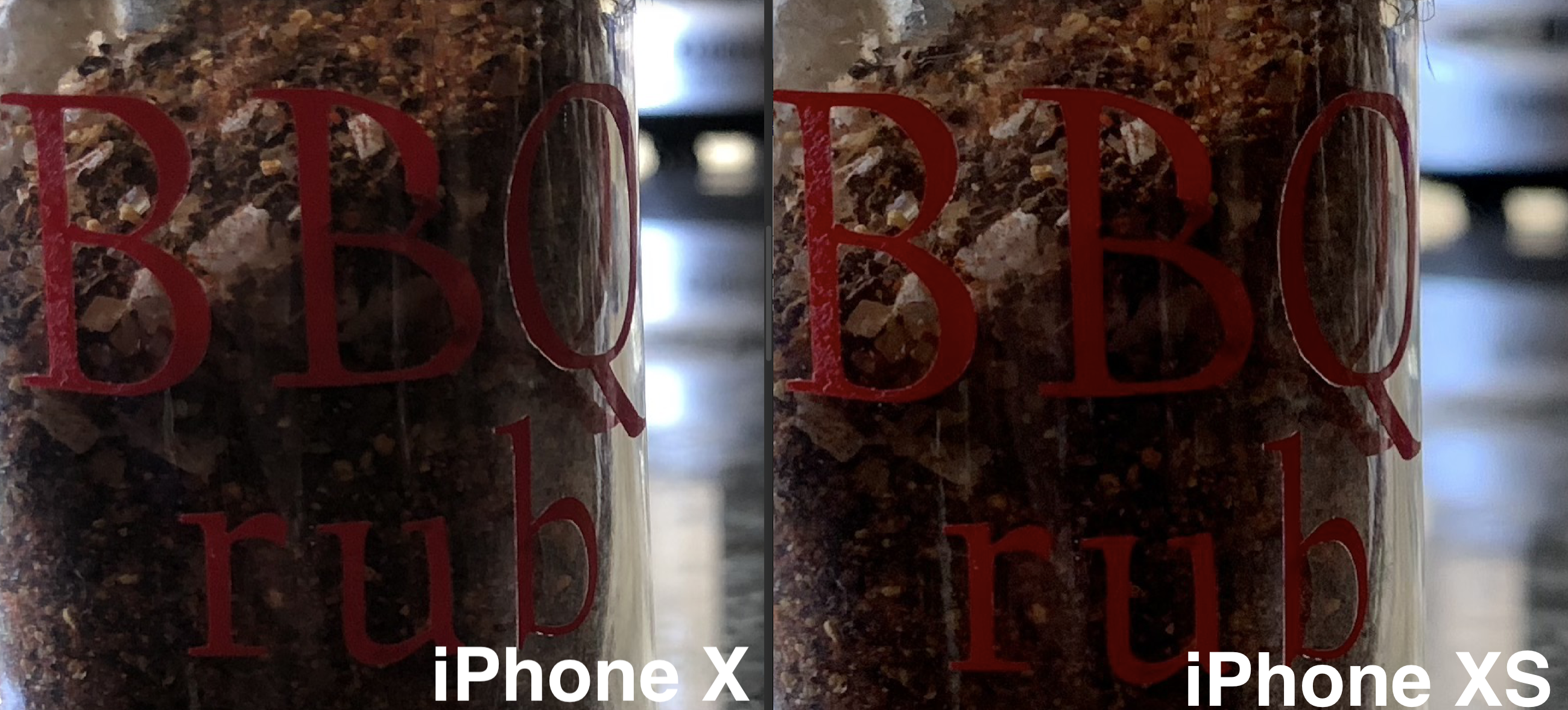 My final test was comparing two tiny bottles of barbecue rub using portrait mode – 0bviously a classic test that all fine photographers use. Instead of showing you the full photo as I did with the others, I’ve zoomed up very close. I wanted to show several things.