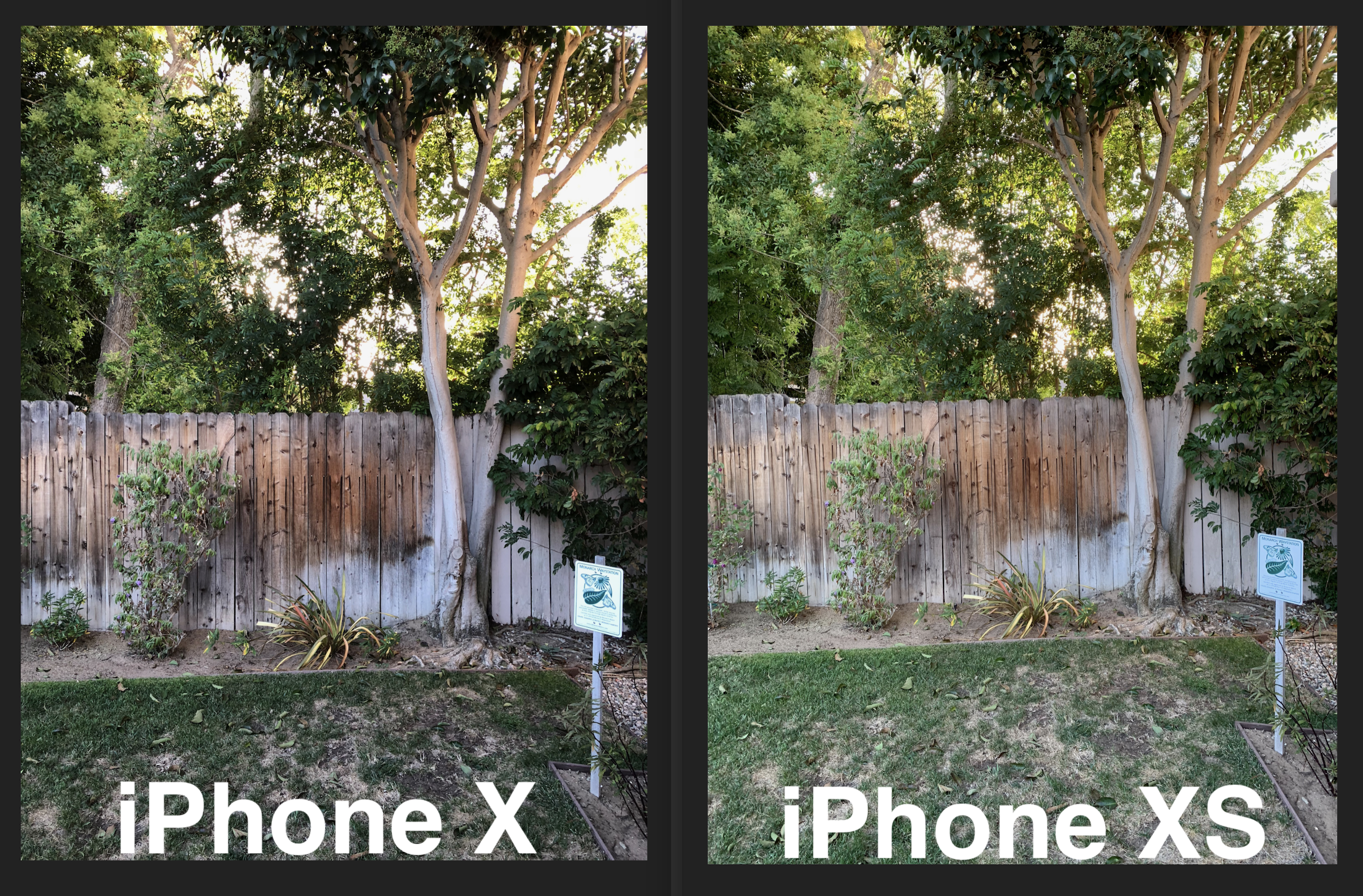 I took one photo of grass with a wood fence, and bright sunlight coming through the trees above. This is probably the best example of the high dynamic range, or HDR capability of the phones. The difference between the X and the XS is pretty dramatic in this test. The X has deep dark shadows, leaving the grass and some of the trees with little definition. The XS does a much better job of capturing the highlights and shadows in the trees, the fence, and the grass. It’s a brighter picture overall but still shows depth of color.