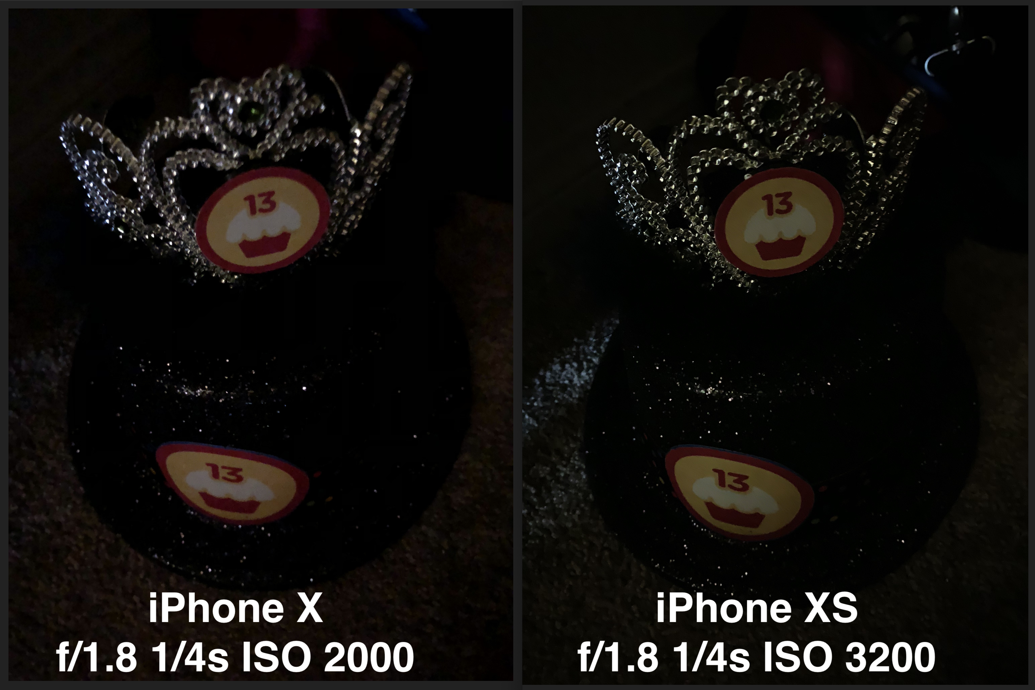 There’s no doubt at all that the iPhone XS captured a far better image. The glittery areas of the crown are very crisp and well exposed. On the iPhone X, the glittery areas almost look like the camera shook, but I don’t think that’s what’s happened. I’d entertain some argument on this point, but the two hats both have the number 13 written on them, and in the iPhone X shot the 13s are both crisp. If it had been camera shake, they would have been blurry too.