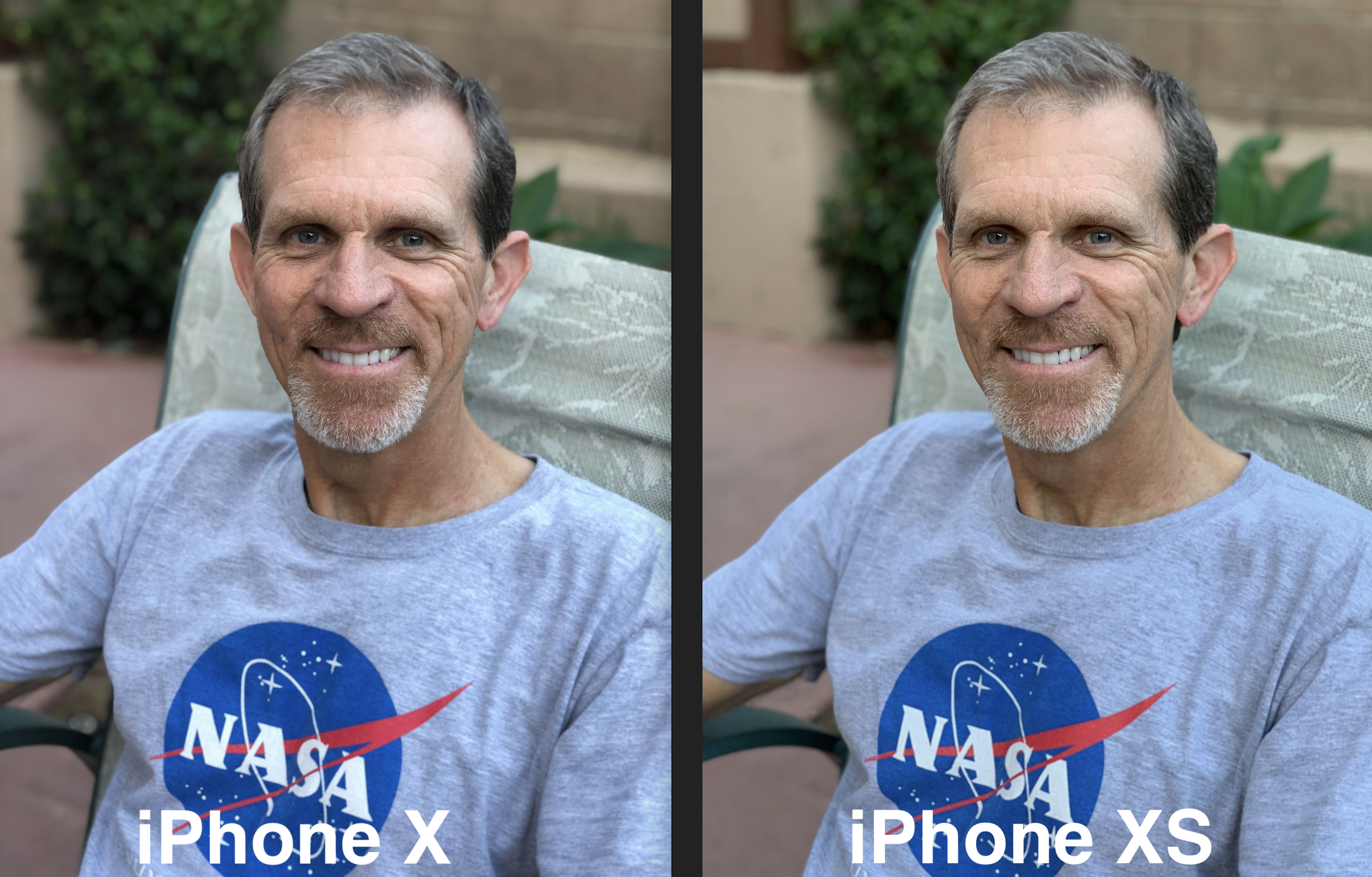 His eyes in the X are deeply shadowed but in the XS the area around his eyes is much lighter. He has more range of skin tone across his forehead and his hair has many different shades. On the X photo, his hair on the side is very dark and without definition. I have to say I don’t notice any big differences in the bokeh they were so excited about. The good news is that the NASA logo on his shirt looks great in both images.