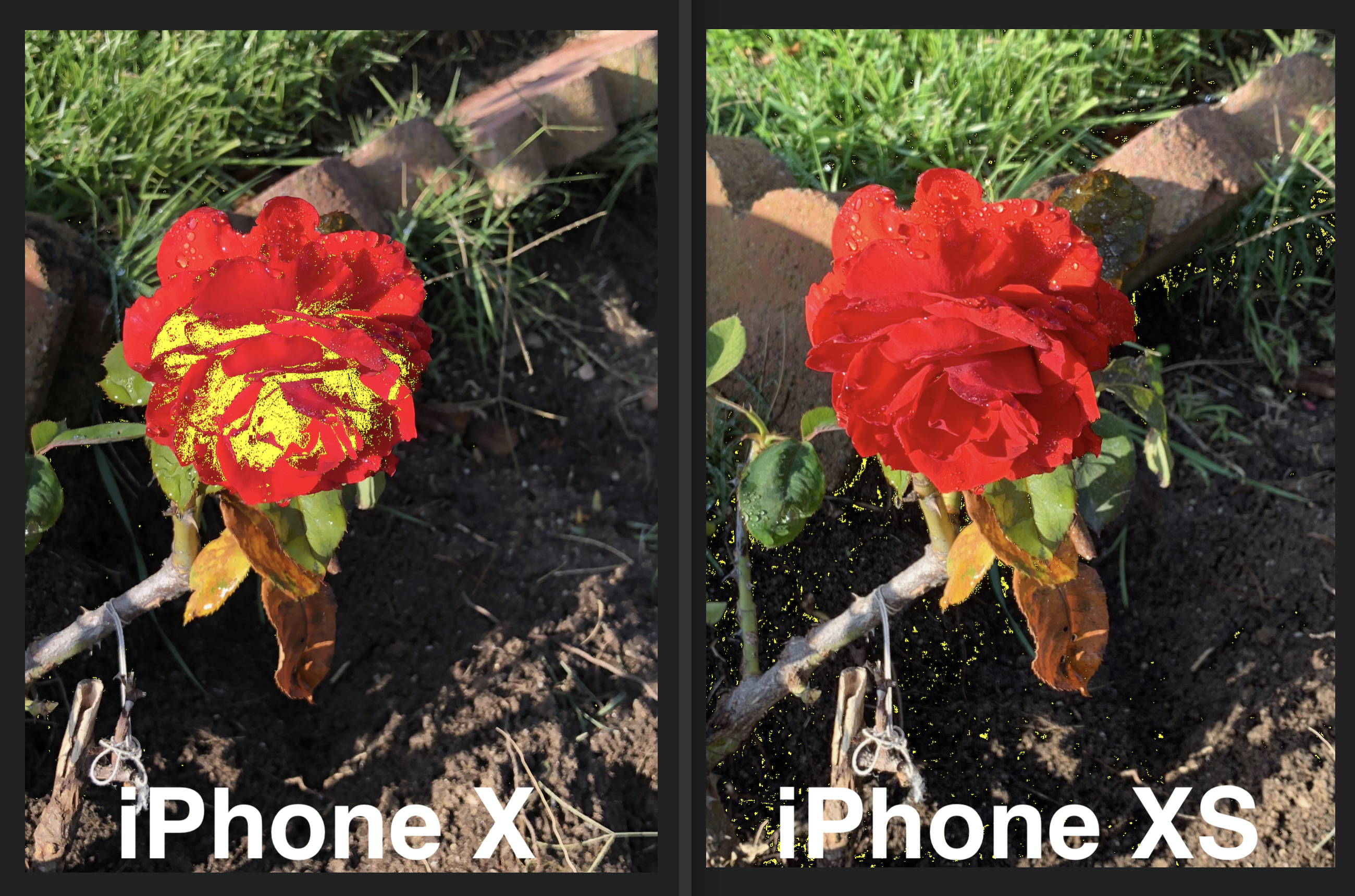 With Clipped Tones turned on, I compared two photos of the same red rose in my neighbor’s yard taken by the X and the XS. The iPhone X has a significant area of the red rose highlighted in yellow, showing that it doesn’t have the dynamic range to adequately capture the red tones in those areas. The iPhone XS has barely any of the tones clipped in the rose, but interestingly a fair amount of the dark ground is showing clipped tones. I guess the rose is the star of the show but clearly, the two cameras chose differently in how to combine the image from their respective sensors.