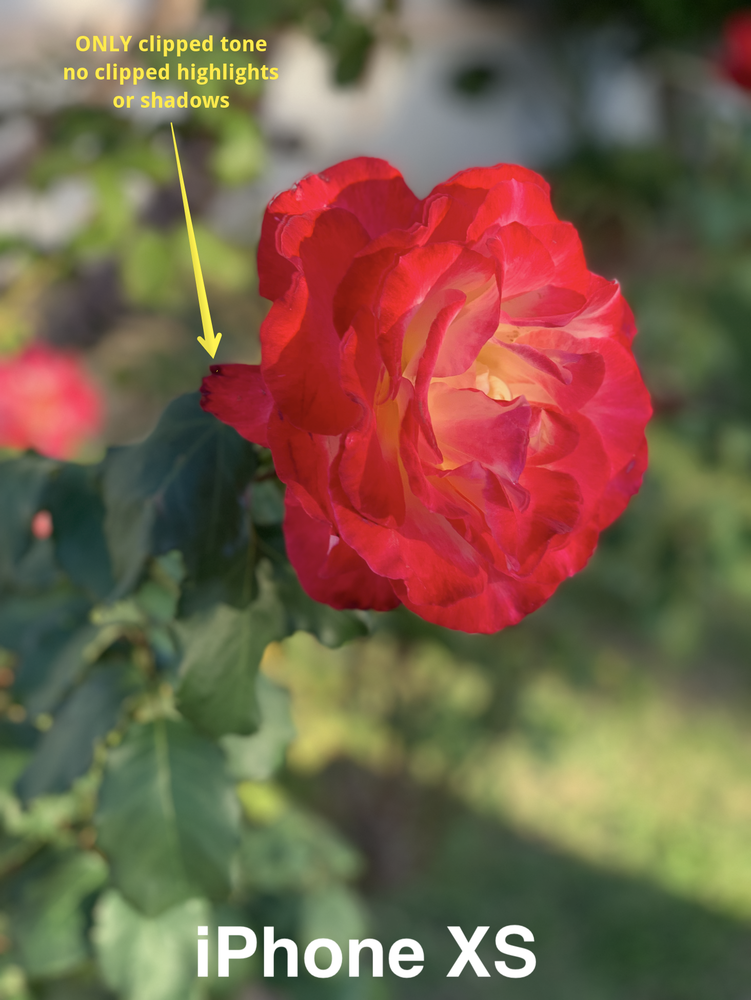 Later after I’d given the iPhone X to Lindsay, I took another photo of a red and yellow rose in great evening sun with just the iPhone XS. I thought it looked pretty great, so I opened it in Affinity Photo and turned on the effect to show me the clipping of highlights, shadows, and tones.