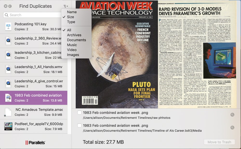 Parallels Toolbox includes a utility called Find Duplicates. You simply drag a directory onto the Find Duplicates floating window to have it scanned for duplicates. It’s pretty snappy at the job. I pointed it at my 28GB Documents folder and it came back really quickly. The first few files it found were pretty tiny so I was glad to see a drop-down menu where I could choose to sort by size. There’s really no reason, other than extreme OCD, to go hunting down duplicate 12KB text documents, or worse yet 750 byte php files left lying around on your drive.
