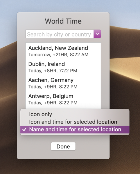 Finally, you can take up a lot of menubar space by selecting name and time for the selected location. Instead of seeing 7:11 pm after the icon, I can see Dublin 7:11 pm without the icon.