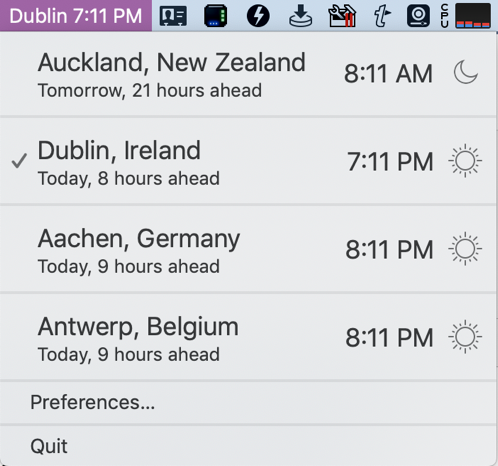 At the bottom of the same setup window, you can choose how the times are shown in the menubar. If you’re a minimalist, you can have just the World Time Icon. But maybe there’s one location you always want to be able to see, like say Dublin for me. You can select Icon and time for the selected location. It doesn’t tell you which location you’ve chosen, just the time.