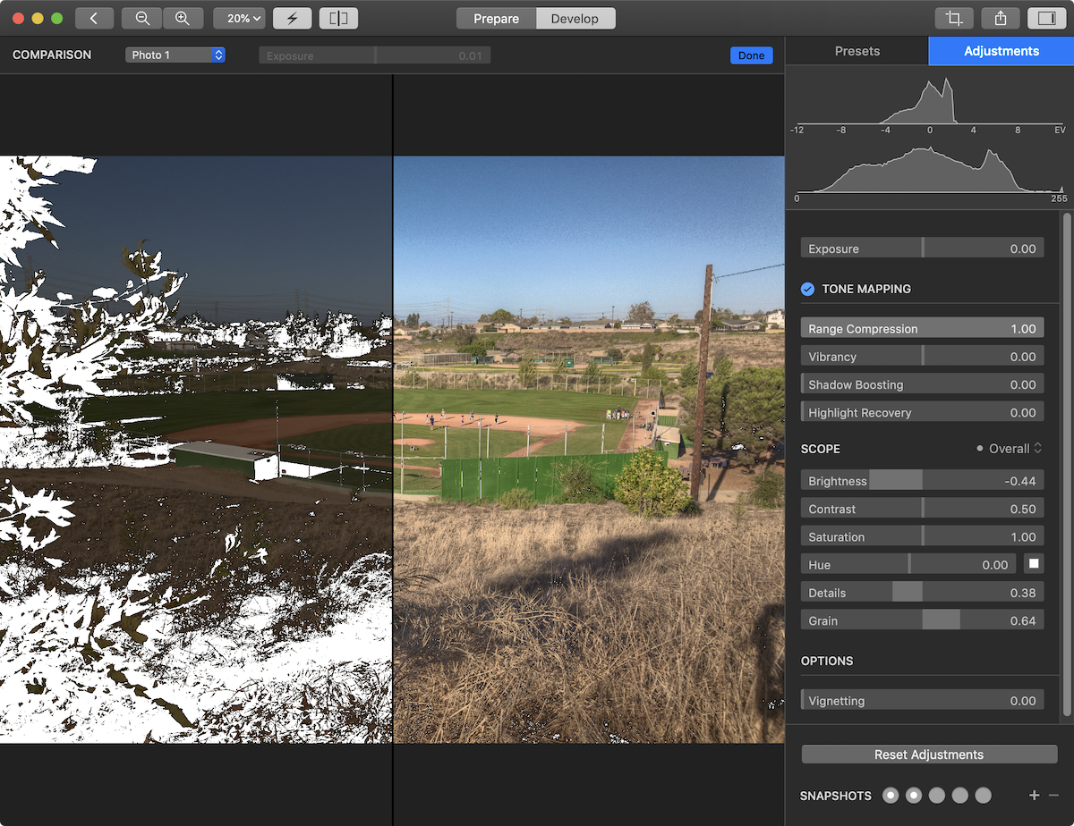 Hydra has a split view that allows you to see the before and after affect of your image adjustments. If you’ve merged multiple images, you can choose any one of the original images to use for the comparison or you can use the unedited, but merged image. I find that sometimes I’ve gone way off the rails with my image adjustments thinking it looks great, but seeing that comparison highlights if I’ve gone too far. In those cases I sometimes find that the original combined image was better than what I’ve done and it’s time to start over.