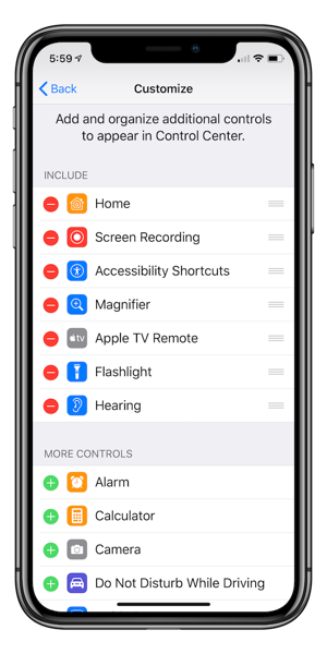 Not to take anything away from the device he got at Braille, I wanted to show him the built-in magnifier in iOS. I opened up Settings, Control Center and then selected Customize Controls. At this point, you can add and delete items from Control Center using the plus and minus buttons, and then use the hamburger buttons to change the display order of the chosen controls.