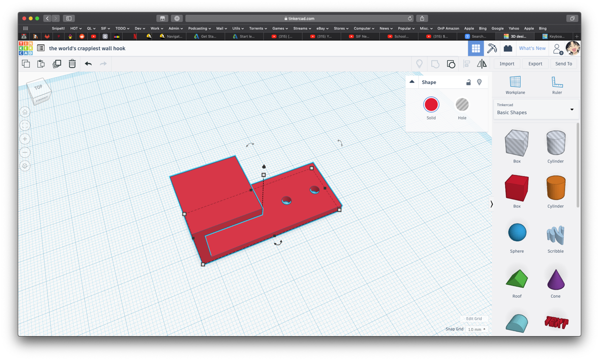 * Headset holder – I work remotely, and so we use voice chat software (Google Hangouts, GoToMeeting, etc.) a lot. I don’t really have a good place on my desk to keep my headset, so it usually ends up falling over the side and getting tangled up in a bunch of cables. So I made a simple wall-mounted hook. And I mean REAL simple. Literally only 3 rectangles connected together. It won’t win any design awards (it’d make Jony Ive cringe) but it works, and took me less than 5 minutes to make in TinkerCAD. https://imgur.com/a/KGP42KP