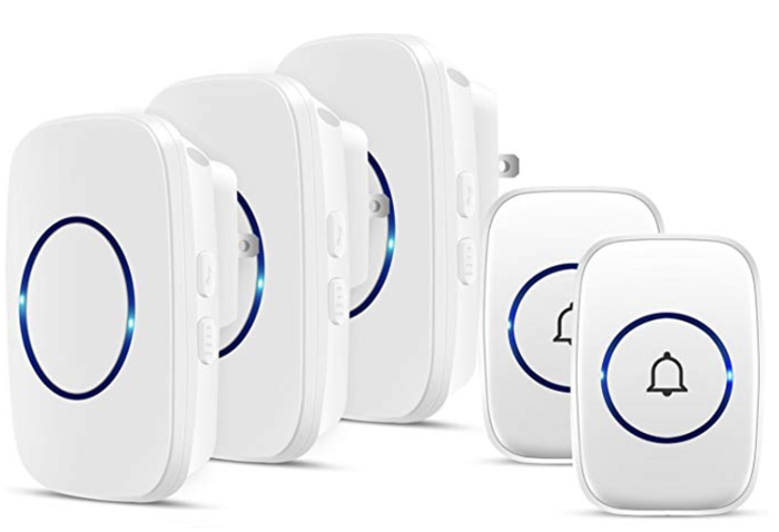 On a recent walk, I found the perfect solution. I found a small, plain cardboard box on the side of the road that said “Digital Doorbell” on the top. I opened it up and inside were two plastic pieces with their plastic peelies still in tact showing it was brand new. One piece is simply a big button with a bell on the front and no other distinguishing characteristics. The second piece plugs into the wall.