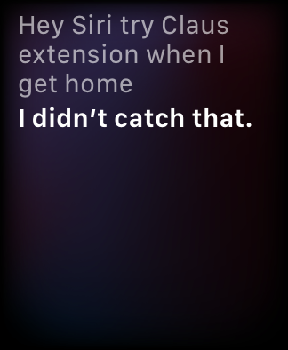 I dictated a reminder into my Apple Watch where I said, “Hey Siri, try Claus extension when I get home”, and it exactly captured what I said. Siri responded by saying, “Sorry I didn’t catch that” and she didn’t set the reminder for me. Looking back at it, I think this may have been operator trouble, because you’ll notice she didn’t record me saying “remind me” so perhaps she didn’t understand the rest of my message. But the next error was all Apple’s.