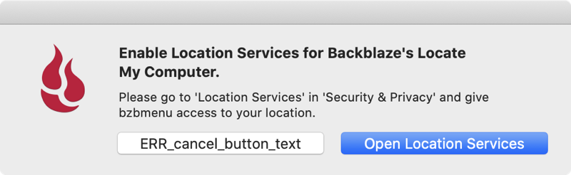 Backblaze popped up asking for me to enable location services so they can help me find my Mac if it’s stolen. The popup had two buttons. One said Open Location Services. But the other button says “ERR_cancel_button_text”. I’m thinking that’s not exactly what they meant to show me.