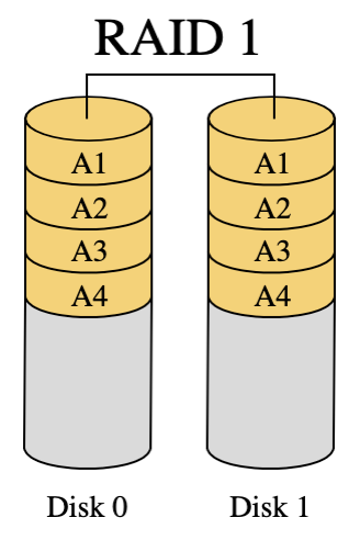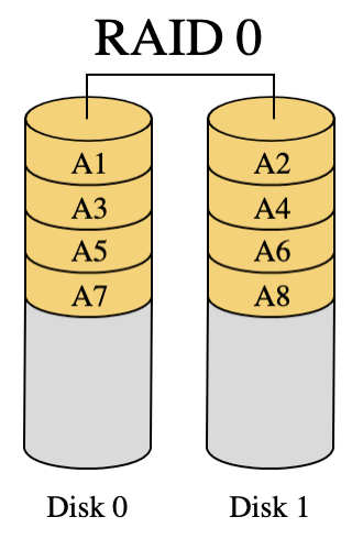 RAID 0 – This is sometimes referred to as “A Striped Volume”, this is where the data is written to each drive contiguously. For example, If you were to split a piece of data into four slices, slice one would be written to drive 1, slice two would be written to drive 2, slice three would be written to drive 1 and slice four would be written to drive 2.