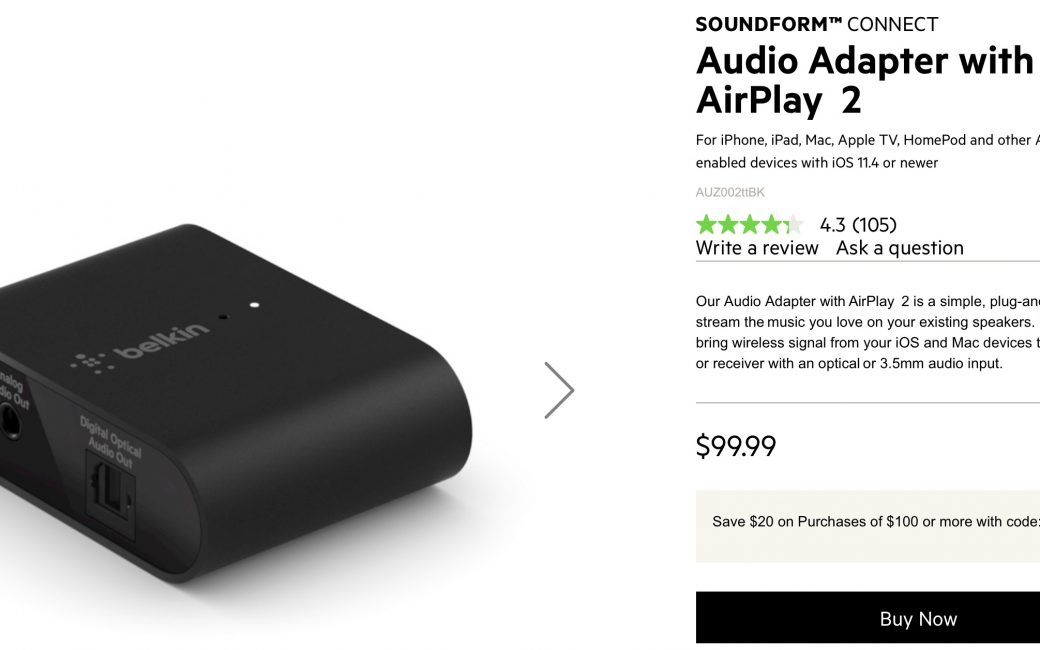 I was discouraged by the price of a new receiver to solve this problem, so I threw out the question to my research assistant Steven Goetz. I asked him what the least expensive solution was to get AirPlay to a stereo. At first he suggested an Apple TV, but then he found the Belkin SOUNDFORM™ CONNECT Audio Adapter with AirPlay 2 for $100. I had found a few little adapters like it, but they all talked about connecting to speakers, not receivers.