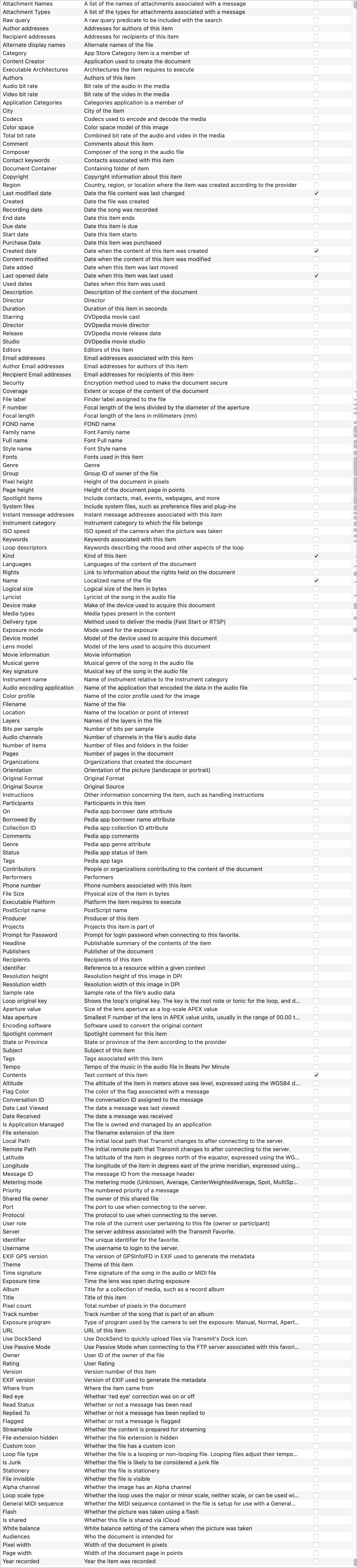 The real power of Spotlight comes when you start to investigate the vast array of criteria you have from which to choose. While the first dropdown field just shows options for kind, last opened date, last modified date, created date, name, and contents, below that it says “other…” Not only am I not going to list off all of the options under “other”, I’m not even going to count the options there are so many. I captured the list using the scrolling screenshot option in CleanShot X and if I shrink it down to see all of them, I can’t even read their names it’s so small. I put a link to the full-sized list in the shownotes for your amusement.