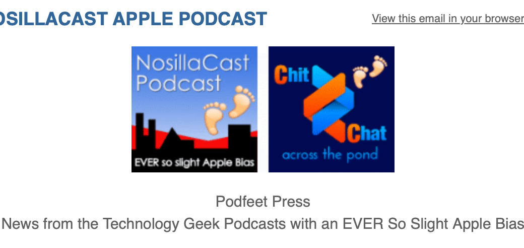 Podfeet Press banner showing NosillaCast and Chit Chat Across the Pond logos and it says "News from the Technology Geek Podcasts with an EVER So Slight Apple Bias"