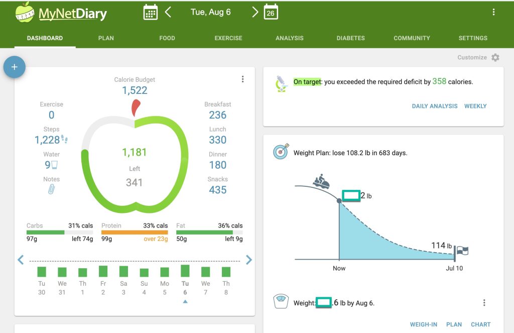 If you look at calories as a math formula, 3,500 calorie loss is about a pound. And if you are looking to lose 50 pounds in a year, that will be one pound a week. Then, it will calculate how many calories you should be eating and how many calories you should be reducing. Then, calculate how much you’re eating compared to how many calories you should have. It tells you when you’re over your suggested calories, “Oh great, you exercised another 200 calories. You still have some more room in your calorie budget.”