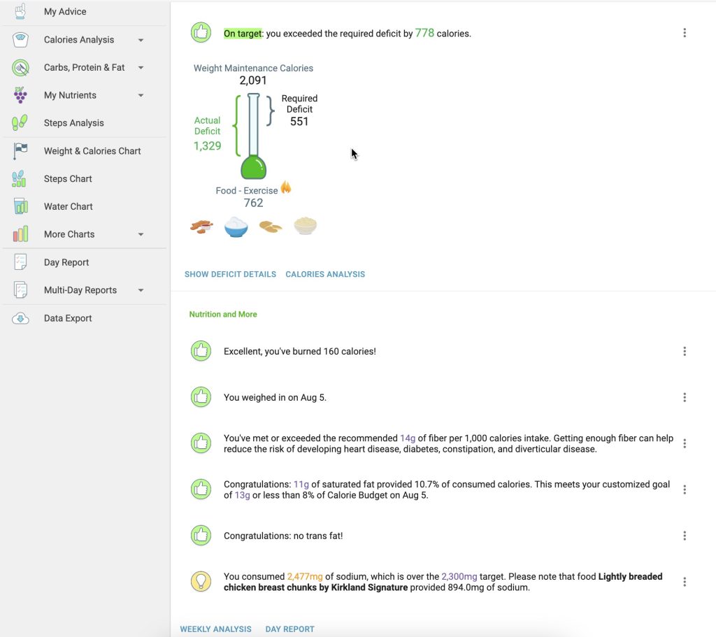 With a premium account, you will get a more sophisticated weight chart showing how you’re doing with your weight over time. You’ll even be able to get charts of your measurements. If you do a digital tape measure or enter them in manually, you’ll be able to see your measurements go down in time with its reporting. For the free level of this software, we’ll give you a daily report of your food. But my trainer was looking for a weekly summary of my food or whatever time frame I wanted. We had an irregular week set up. That is part of the premium account. I also get a nice weekly summary of my health targets.