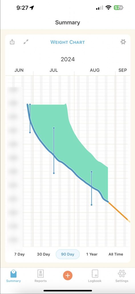 One of the things that Happy Scale will allow you to do is smooth out your numbers. So when you lose weight, some days you go up 0.6, the next day you go down a pound, and the next day you go up 0.2. And it’s variable based on whether you ate a lot of carbs, had a lot of salt, drank a lot of water, or to make you miserable. Unfortunately, even though it’s primarily a math formula, weight isn’t exactly a math formula. There are a lot of things that determine your weight for a day. Sometimes, scales make people unhappy because they see the ups and the downs. This is what Happy Scale tries to make easier for you. It will show you a chart that smoothes out the bumps with the general slope of your line. So that you can see how it’s going and not get so worked up about the highs and the lows.