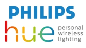The Philips Hue logotype. It consists of the Philips brand name in a dark blue, the Hue brand in rainbow colours, and the slogan "personal wireless lighting".