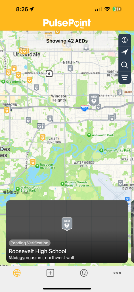 There are some stories of life-saving events on the web. A fellow was on a fun run, and he started having a cardiac event. And a fellow who was right there started doing CPR with him, but he’s not trained. He’s like me. I used to be trained, but it’s been a while. So, he started doing CPR the best he could. Immediately, a nearby lifeguard was notified, and he came running. He was able to take over for CPR from this guy because he knew a little bit more. Then, someone could bring an AED device that was available in a nearby park as marked on the map. This man recovered. It was a critical situation. Time was of the essence, and they were able to save this person’s life because this app connected everyone who could help.