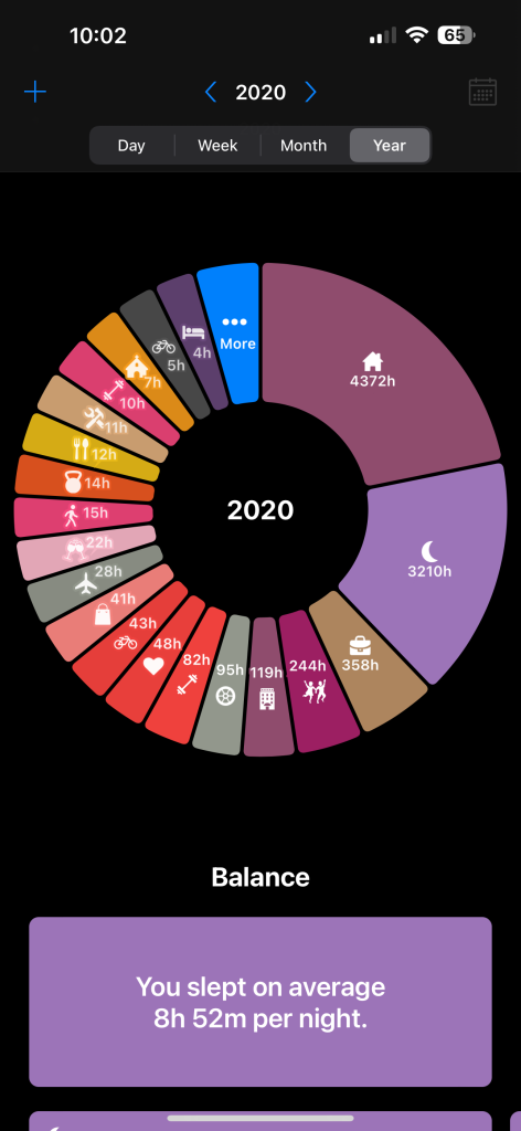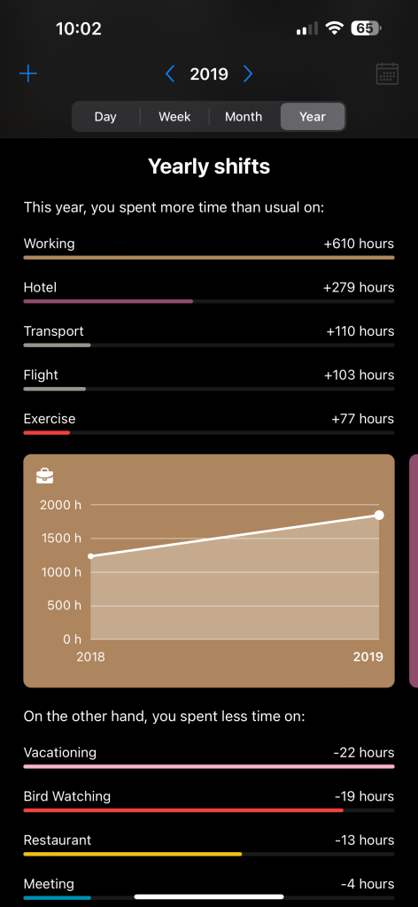 Then, I can see the top locations where I’ve done this activity and the total number of times I’ve been there. I’ve gone to my favorite marsh 259 times. That’s not surprising. But again, I can look at a day, and the day will show me what I did today. I can look at a week, month, and year basis and see the stats of how I’ve done this month and this year. Am I birdwatching quite a bit? Do I go hiking a lot? Am I sitting at home way too much? It will remind me of how often I do an event. I went to a restaurant last week, and it was suggested that I hadn’t eaten out in a long time. It is called a returning habit. But if you’re doing something all the time, it will call it a continuing habit. I go to the gym three times a week. Yay me.