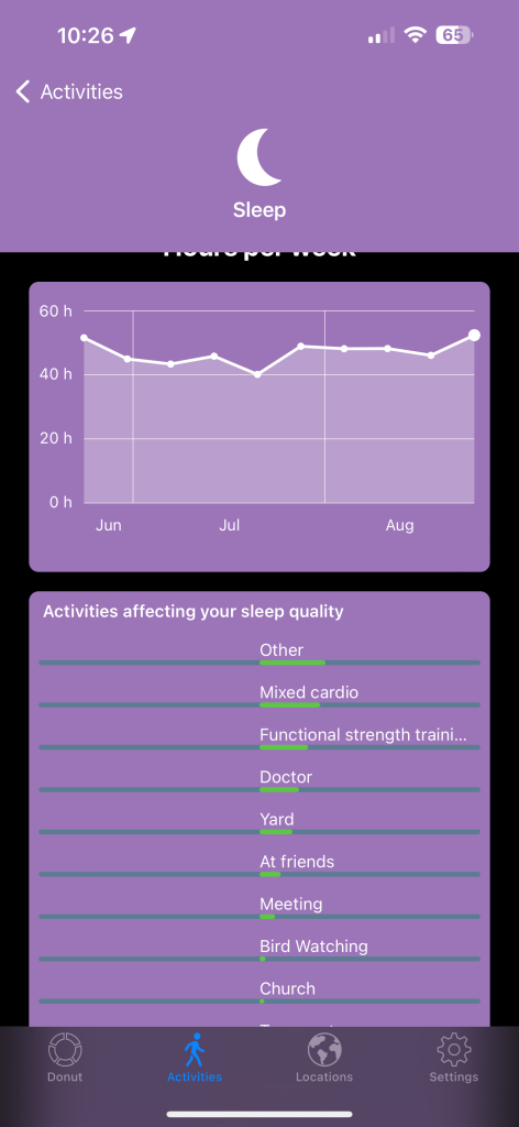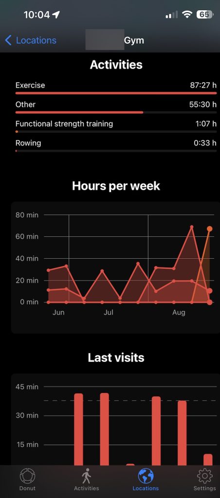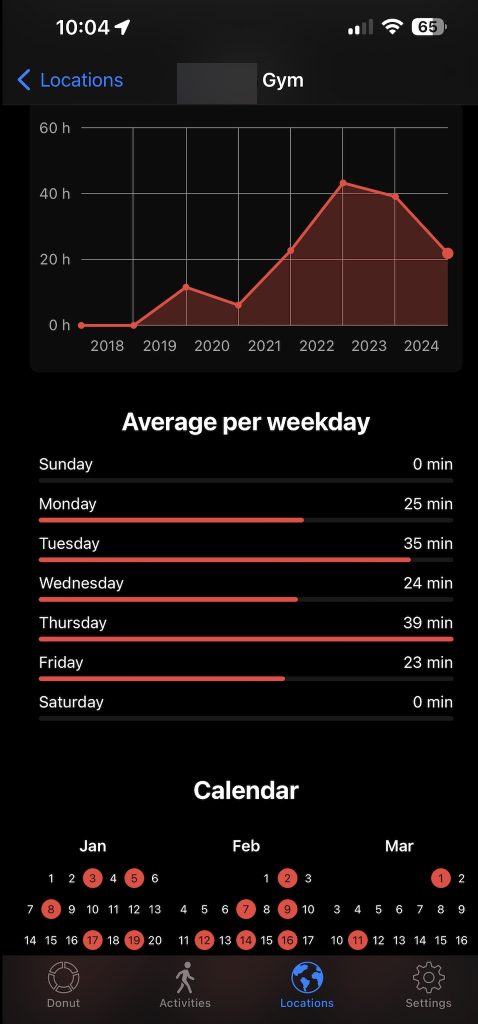 It creates a nice pie chart it calls your daily donut. But now I really wish I had a donut. But that pie chart shows me how I’m spending my time. How much time was sleeping? It takes that from the Health Kit. How much time was I walking? Driving? How much time did I spend at the doctor’s today? And how much time did I spend at the gym? If I’m looking at it weekly, monthly, or yearly, it will create line charts for me to see how much I’ve done recently. What are some habits I’m still doing, and what are some habits I’m doing again? At the very bottom of the page, it will show you any location it doesn’t know about and wants you to sign an activity to. So if I go to a brand new park, I can say this is Bob’s Park. What do I do there? I go bird watching. Now, I will never forget it. In the end, it’s a little detail, but it does give me the ability to remember what I do, what days I do it, and how often.