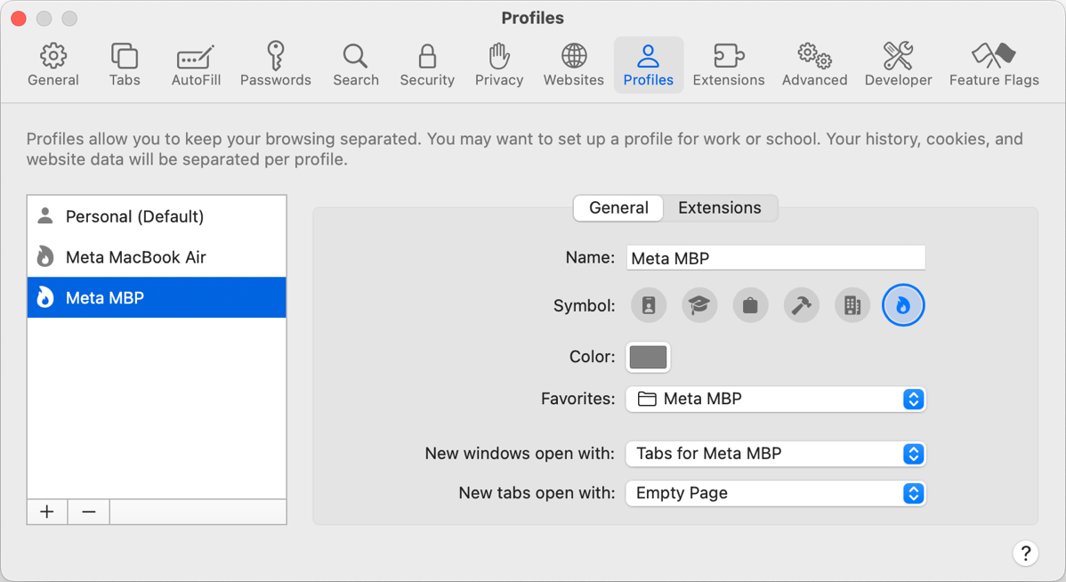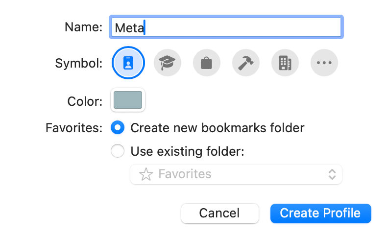 Then on the Profiles tab in System Settings is where you create a new Profile. As soon as you give it a name, you have the option to create a new bookmarks folder for Favorites. As soon as this new bookmarks folder exists, still in the Profiles tab, I needed to set new windows to open with and choose “Tabs for Meta”.