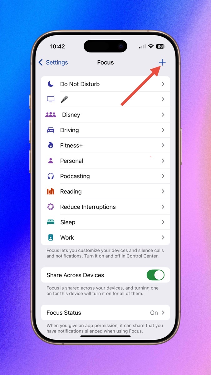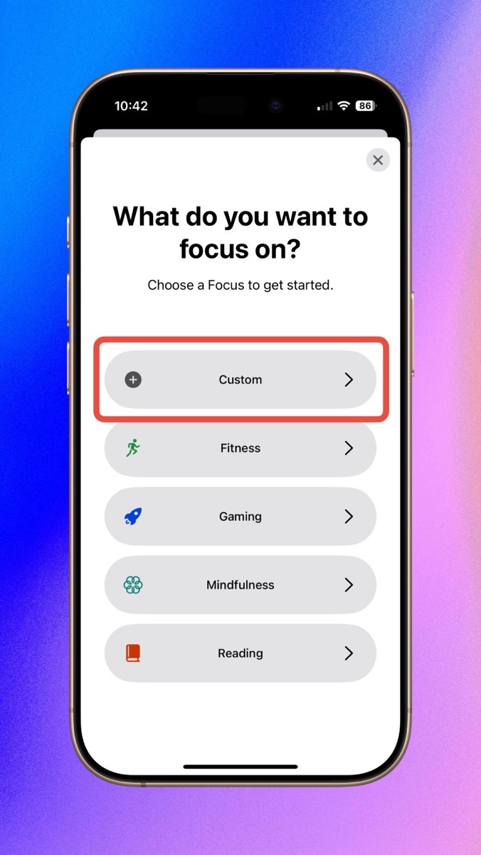On iOS, open Settings → Focus. Tap the + icon in the upper right to add a new Focus mode. On the next screen you’ll be asked what you want to focus on with a few stock options, such as Fitness and Gaming (who has trouble focussing on gaming?) We’re going to choose Custom.