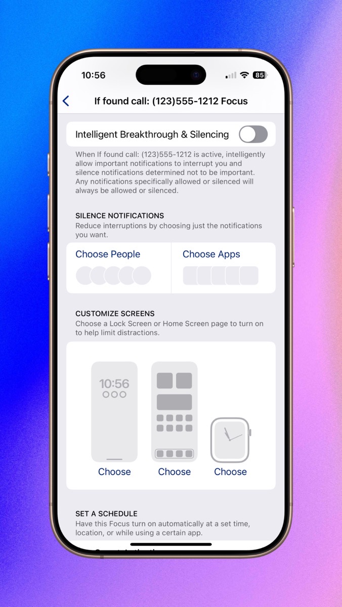 You’ll see a plethora of options, including Intelligent Breakthrough & Silencing, along with the ability to choose people and/or apps to break through. You can customize the lock screen or home screen based on being in that focus mode. I didn’t mess with any of those options, but below that we can set a schedule.