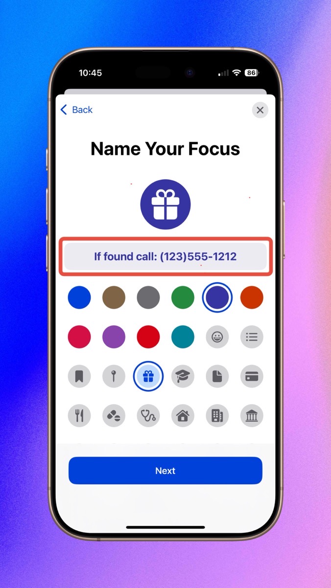 Next, you’ll be asked to name your Focus. The name you choose will be your lock screen message. In my case, I named my Focus “If found call: “ followed by Steve’s cell number. Next choose an icon for your Focus. This will also show on your lock screen. I didn’t see a way to not show an icon, so I chose the little present because it would be a gift to me if someone returned my phone.
