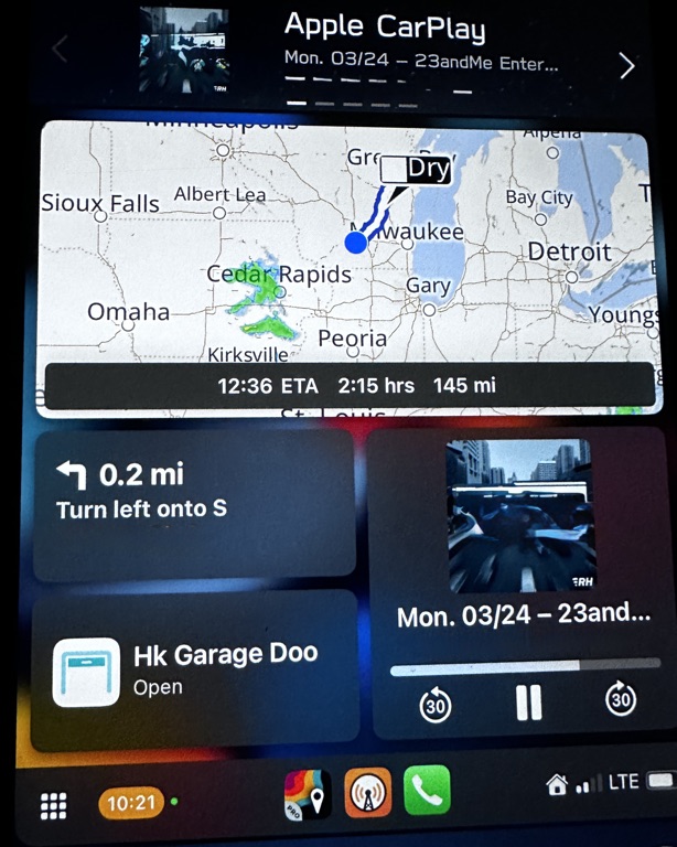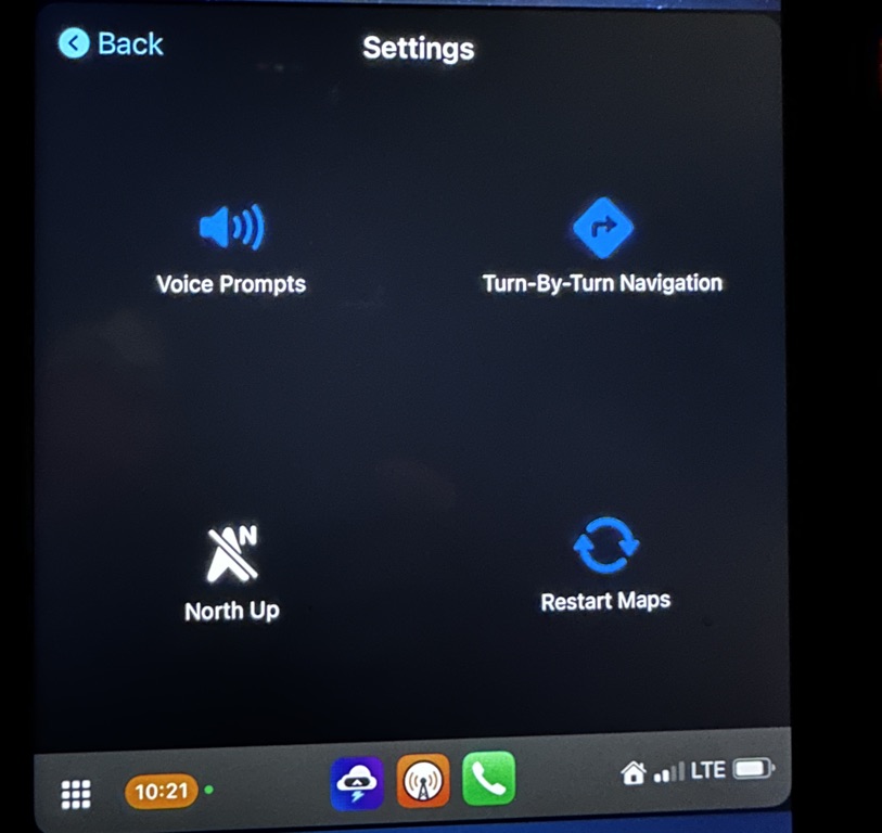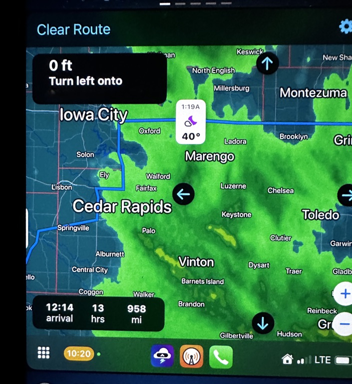I also use the app MyRadar which has its own CarPlay app. This is another of my favorite radar apps. They do great radars that are low bandwidth which is nice for spotty cell reception areas. For whatever reason, its maps haven’t performed as well in winter—probably due to radar sensitivity (I won’t get into that). Carrot consistently provides a perfect radar image in every season. If you’re into piloting, MyRadar does offer features geared toward aviation, so that might be a plus for you. At this point, the main reason I use MyRadar is that it has an Apple Watch radar widget, which Carrot doesn’t offer. That said, Carrot’s other widgets are better, so I feel like Carrot is the better deal overall. So now I have two radar options, and they both do almost exactly the same thing: basic navigation and radar display.
