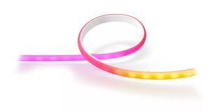 The Hue Solo lightstrip is available in 3m, 5m, or 10m lengths. It is a flat strip, quite similar to the NanoLeaf one, that shines a single colour of light from LEDs along its entire length. The covering is clear plastic, which means you can see the LEDs. It cannot be extended, but can be cut shorter at specifically marked points. It starts at USD$99 for the 3m version.