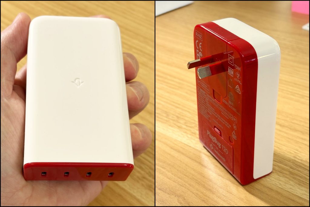The PlugBug Travel 120W weighs a significant 260 g (with the NZ adapter installed), and measures 104 × 60 × 30 mm. That 30 mm depth is important. Although you do need to add the depth of the power pins to get it into a socket, it does mean you’re more likely to get it plugged in behind that hotel bed or side table. With the New Zealand or US adapter attached, you’ll need only around 50 mm of space to get it in. The ports are all on the bottom, which means this depth is truly as much space as you’ll need. My NZ-only GAN chargers are 60 mm deep and then the cords come out the front, meaning you require over 100 mm of space.