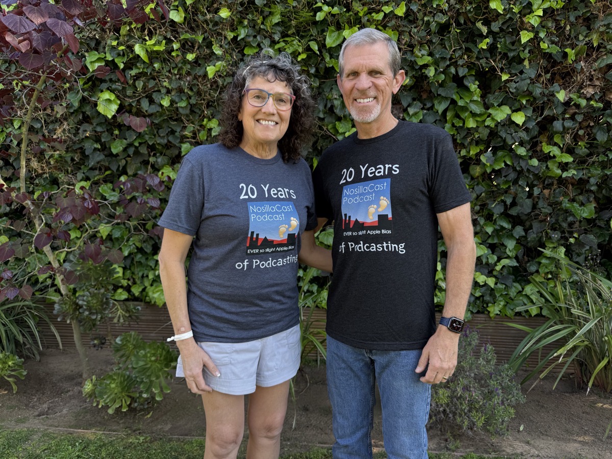 The 20th anniversary of the NosillaCast is on the event horizon! For those who can spare the time, we’ll be celebrating it during the live show on Sunday, May 11th, so be sure to come with your party streamers and noisemakers! And if you haven’t yet bought your 20th anniversary NosillaCast shirt, head over to podfeet.com/shop to get yours today. I put a photo of me and Steve wearing our new vintage navy and vintage black shirts. I love them so much, and many thanks to Allister for helping me noodle out the design!