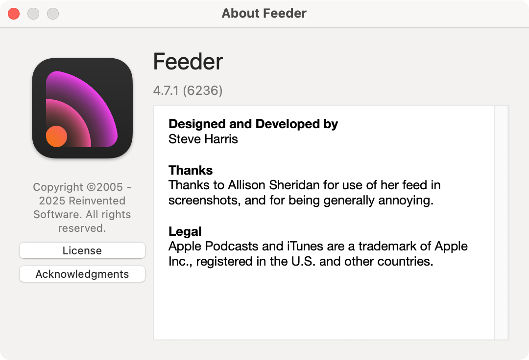 I know Steve appreciates my input on his software, since the About page says, ” Thanks to Allison Sheridan for use of her feed in screenshots, and for being generally annoying.”