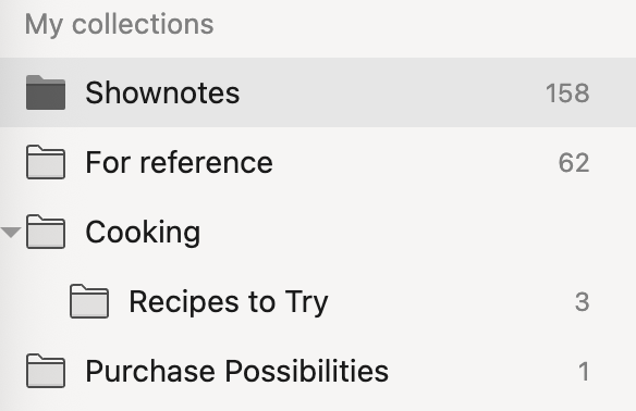 Now, I save all news stories in the Shownotes collection, and all recipes in the Cooking → Recipe to Try collection, and I can use the same tags for different things without ever messing up my search results!
