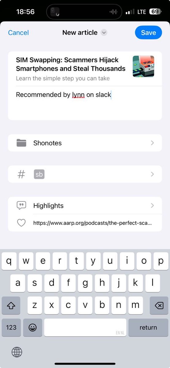 First, an example of me capturing a story recommended from a NosillaCastaway in the Podfeet Slack using the iOS share-sheet: