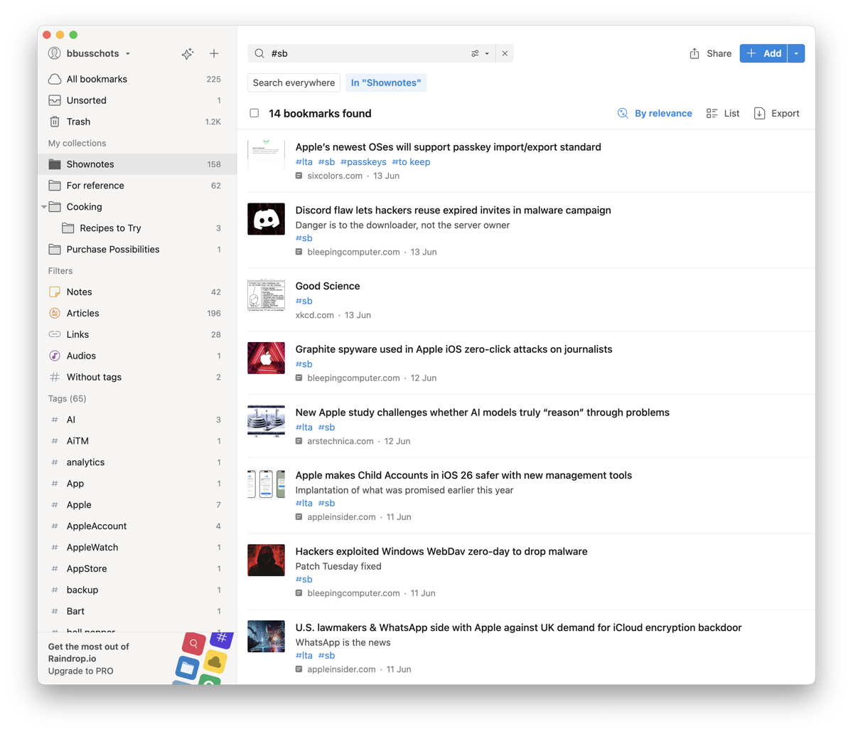 In Pocket, a bookmark had a single category, so stories that were relevant to both Security Bits and Let’s Talk Apple were a problem. My workaround was to always carefully save such stories into the category for the show that was the nearest in the future, and then move them once I was done creating the notes for that show. This was cumbersome and inevitably, some stories got missed for one show or the other because I put them in the wrong category first, or forgot to move them.
