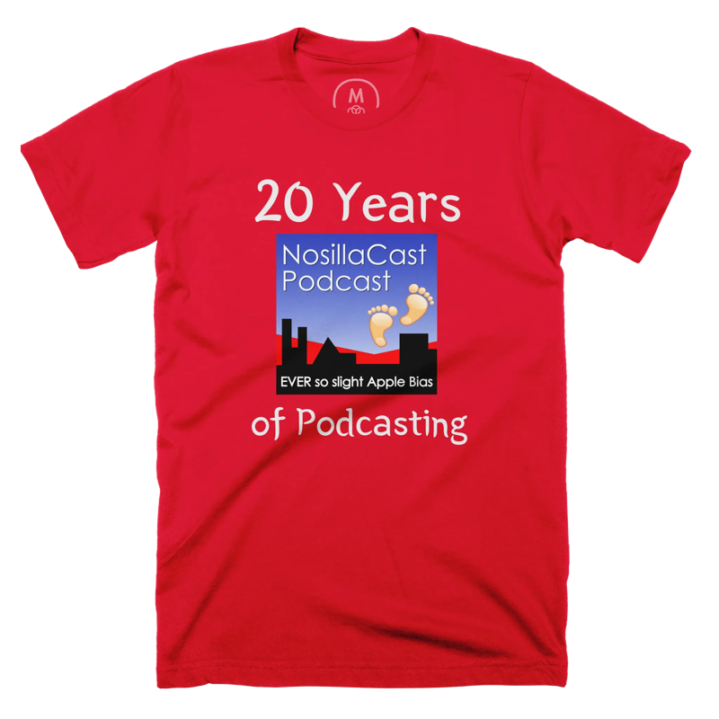 The cool kids have been sending in photos of their cool new NosillaCast 20th anniversary shirts. I have been a big fan of the vintage shirts for their softness, but they convinced me to give the regular 100% cotton shirts a try. I bought the red one for myself, and it’s brilliant! The colors really pop on the red, and the shirt is just as soft. If you’d like to be one of the cool kids by showing your joy about the show with the world, you can get a t-shirt, a mug, or a tote bag, all announcing 20 Years of Podcasting. Simply go to podfeet.com/shop.